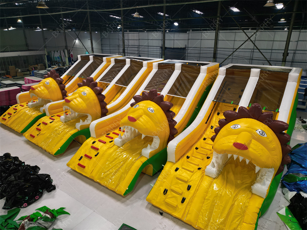 اینها سرسره های بادی هستند که برای استفاده با استخرهای شنا طراحی شده اند. آنها دارای یک طرح سر شیر زنده هستند، با رنگ زرد روشن